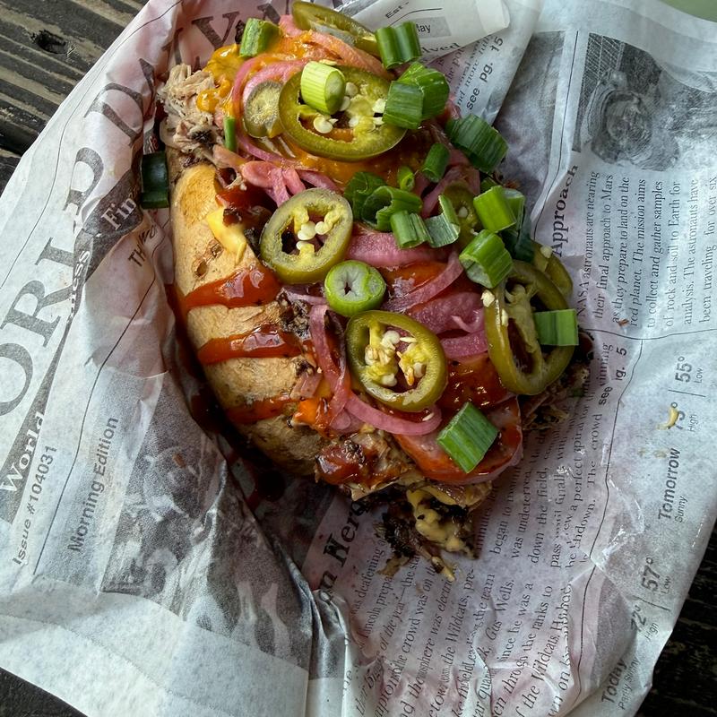 Baked Potato with Cheddar Cheese Sauce piled with Brisket, Pulled Pork, and Sausage, Fiasco BBQ Sauce, Fiasco Mustard Sauce, Pickled Red Onion and Smoked Jalapenos