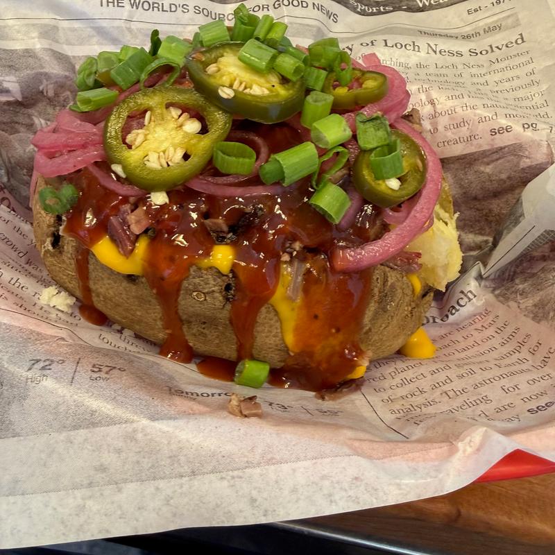 Baked Potato with Cheddar Cheese Sauce, Tender Brisket, Fiasco BBQ Sauce, Pickled Red Onion, and Smoked Jalapenos