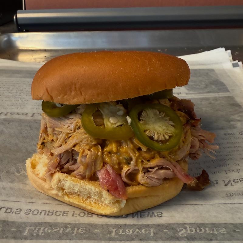 Slow-smoked pork shoulder, pulled and piled high with Fiasco mustard sauce and smoked jalapenos